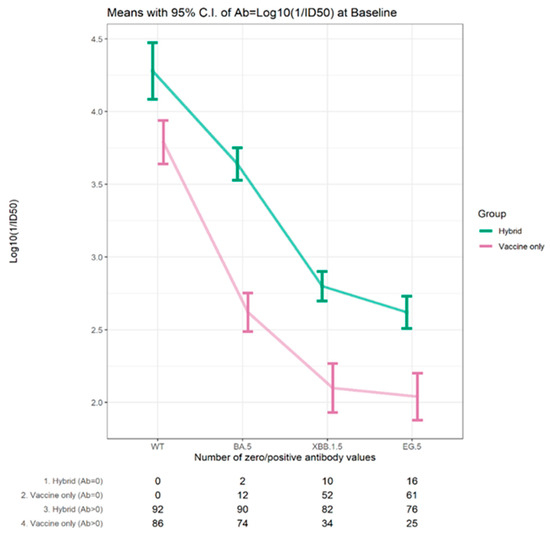 A neutralizing antibody response to the Wuhan ancestral strain at baseline was detected in all participants, with a significantly higher mean antibody of 4.28 log10 (1/ID50) for the hybrid cohort compared to 3.79 log10 (1/ID50) for the vaccine-only cohort (p = 0.0001), as shown in Table 2.