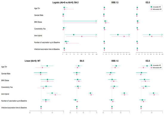 (upper panel) Logistic regression of factors influencing the detectability of the neutralizing antibody to Omicron BA.5, XBB.1.5, and EG.5 variants. (top 3 panels). (lower panel) Linear regression of factors influencing the neutralizing antibody titers to Wuhan and Omicron BA.5, XBB.1.5, and EG.5 variants in those with detectable levels. (bottom 4 panels).