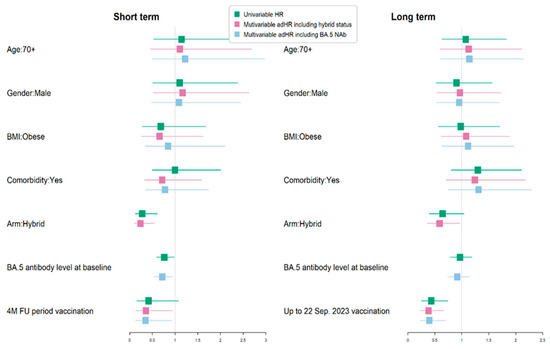 To examine protective factors against a new breakthrough infection in the short-term (4 months) and longer-term period (10 months) after the baseline visit, up to 22 September 2023 (when the XBB monovalent vaccine became available in Ontario), a Cox regression analysis was conducted. The time of the first breakthrough infection from the baseline visit date up to the 4-month follow up and to 22 September 2023 was used as the outcome for the short-term/longer-term analysis. The analysis included fixed time-independent predictor variables, such as age groups, gender, obesity, comorbidity, hybrid/vaccine-only immunity at baseline, vaccination during the short term/long term, and breakthrough infection during the respective period. As the predictors of hybrid/vaccine-only immunity and neutralizing antibody titers to BA.5 at baseline are interdependent, two distinct multivariate Cox regressions were performed to evaluate their respective effects.