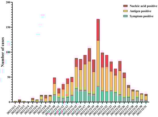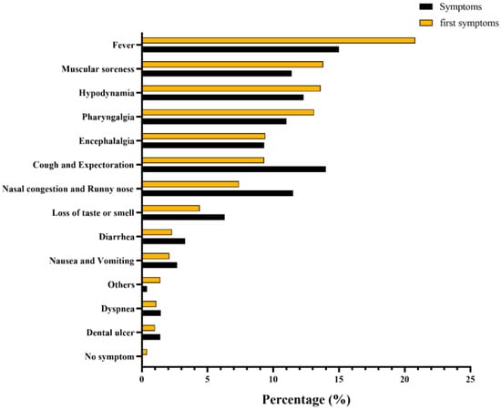 The results of the epidemic curve showed that cases started to appear on 1 December 2022, and subsequently gradually increased, reaching a peak on 20 December 2022 and presenting a downward trend from then on (Figure 2). Based on the number of residents living with each participant, including the infected cases, the average secondary attack rate (SAR) was calculated to be 91.7%. Of the 1663 infected patients, only 175 (10.5%) chose to seek medical care. Regarding the first symptoms and the symptoms during the whole course of infection in patients, the distributions were slightly different, among which fever was the most common, accounting for 20.8% and 15.0%, respectively (Figure 3).