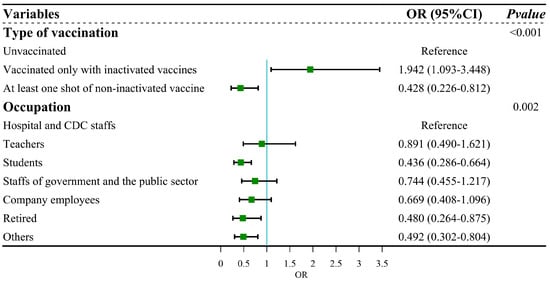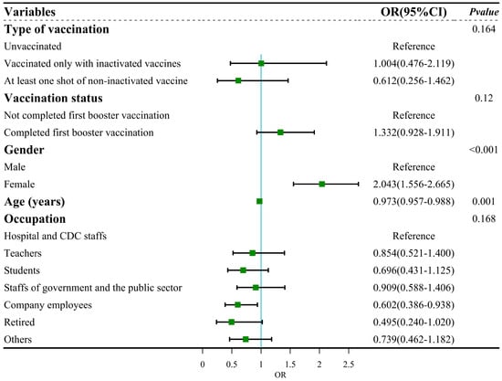 We first conducted univariable logistic regression to evaluate the association between vaccination status, sociodemographic characteristics and symptom severity. The results of logistic regression analysis showed that five factors, namely, type of vaccination (p = 0.044), vaccination status (p = 0.037), gender (p < 0.001), age (p < 0.001) and occupation (p = 0.002), were associated with symptom severity (Table 4). These factors were included in the multiple logistic regression. After adjustment, the results showed no statistically significant differences in COVID-19 vaccination with symptom severity (Figure 5). The adjusted model passed the Hosmer and Lemeshow test (χ2 = 13.669, df = 8, p > 0.05), indicating that this model was a good fit. The result of the collinearity test showed that the tolerance > 0.5 and VIF < 3, which suggested no collinearity among independent variables.