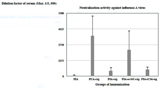 From the vantage point of immunological significance, a glycolipid could be the optimal component, like α-GC, in order to upregulate antibody titer (Figure 1 and Figure 4). But we could be misled by a rational design of vaccination to prompt a superior antibody titer by sparing other correlates of pathogenesis, for instance the quality of immune responses (Figure 2, Figure 4 and Figure 5) [45,46,47]. Based on results from Figure 2, Figure 4 and Figure 5C, IFA-antigen raised a significant level of specific antibody titer but a minor level of neutralizing activity against the influenza virus (graphic abstract). An inactivated vaccine actually contains a variety of viral antigens to induce many types of immune responses. In this research, it would be inappropriate to make a conclusive statement that pathogenic mechanisms are simply mediated by one type of adjuvanted vaccine-induced immune response. There will be no limitation for prospects of future research projects to further elucidate detailed pathogenic mechanisms induced by vaccination.