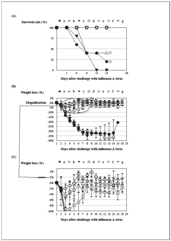 Protection against mortality and morbidity induced by distinct vaccine formulations in an aluminum hydroxide adjuvant following infection with the A/California/07/2009 (H1N1) virus. BALB/c mice were immunized s.c. with ●: PBS as a control group (a), △: IFA (b), ▼: AH (c), □: IFA plus antigens (d), ◇: AH plus antigens (e), ○: AH plus antigens formulated with α-GC (f), and ▽: AH plus antigens formulated with C34 (g). Immunized mice were challenged with an A/California/07/2009 (H1N1) virus following the final immunization at a 3-week interval. Mortality (A) and morbidity (B,C) were observed and recorded daily after a lethal challenge of the A/California/07/2009 virus. (C) was the magnified version of (B) from day 2 to 9. A similar result was reproducible in another independent experiment (ANOVA analysis from day 4 to 9, p < 0.05).