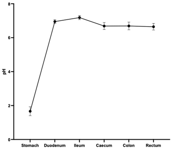 The pH along the gastrointestinal tract of 6 Golden Syrian hamsters with triplicate readings taken from each region of each animal. The averages of the means of the triplicates are shown with standard deviations displayed by bars.