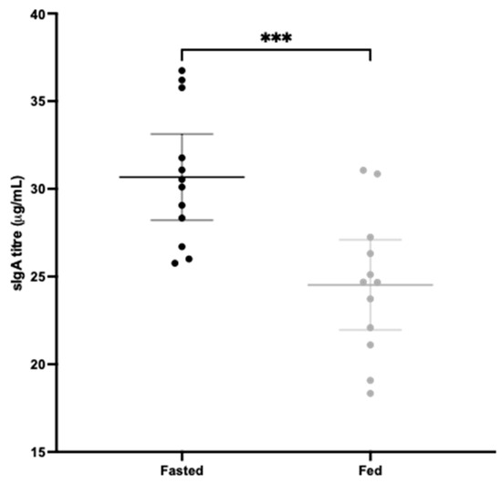 Total sIgA in small intestinal lavages of fasted and fed hamsters measured by a total sIgA ELISA kit. Lavages were taken at the experimental endpoint, 2 weeks after intra-gastric administration of 3 capsules containing CD0873. The means of 2 independent ELISA assays and medians of technical triplicates within each assay are shown. Middle bars represent the mean and outer bars represent 95% confidence intervals. The data were analysed by an unpaired 2-tailed T-test. Statistical difference p value: *** p ≤ 0.001.