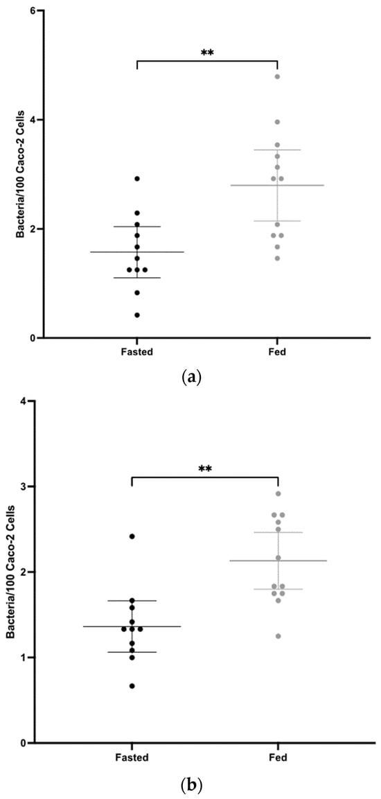 The fasted group showed a significantly greater mean sIgA titre in intestinal lavages than the fed group, where p = 0.0010 (Figure 4). In all three adherence assays, significantly greater mean blocking activity was observed in the fasted group compared to the fed group. As the MoI increased, significance increased; for MoI 20, p = 0.0033, for MoI 25, p = 0.0011 and for MoI 80, p = 0.0005 (Figure 5). The highly significant result for the last experiment using a heavy inoculum demonstrates strong functionality of the antibodies generated. There was little visible difference in the degree of variation between the two groups for the sIgA titre (Figure 4) or for adherence blocking activity (Figure 5). Levene’s test confirmed no significant difference in variance.