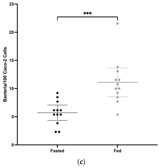 Adherence of cells of C. difficile strain 630 to Caco-2 monolayers following their pre-incubation in intestinal lavages of fasted and fed hamsters, diluted 1:2. Three different sized inocula of C. difficile were used; MoI 20 (a), MoI 25 (b) and MoI 80 (c). Adherence was measured by enumerating CFU from washed, trypsinised Caco-2 cells. Each dot represents one animal. Middle bars represent the mean and outer bars represent 95% confidence interval. The data were analysed by an unpaired 2-tailed T-test. Statistical difference p value: *** p < 0.001, ** p < 0.01.