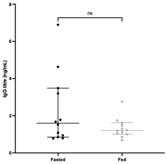 To test if fasting also influences the systemic IgG response, blood was harvested by cardiac puncture at the experimental endpoint and serum tested in an indirect ELISA to quantify CD0873-specific IgG for each animal. Figure 6 shows that the fasted group exhibited higher IgG titres than the non-fasted group, although the overall difference was non-significant.