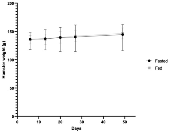 Finally, since the Torpac capsules used in this study were designed for rodents over 150 g and very few hamsters reached this weight, we assessed whether dosing was more effective in heavier hamsters. No effect of weight on immunological responses per animal was observed. The effect of fasting on weight per se was also assessed. Both groups showed similar mean weights over the time course of the study (Figure 7).