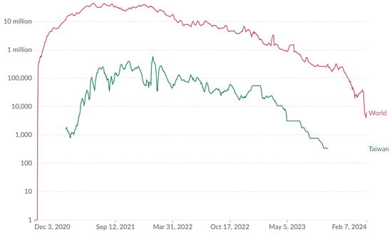 Daily COVID-19 vaccine doses administered with a 7-day rolling average. All doses, including boosters, are counted individually. (Results were analyzed by Our World in Data (https://ourworldindata.org/explorers/coronavirus-data-explorer?yScale=log&zoomToSelection=true&facet=none&uniformYAxis=0&country=OWID_WRL~TWN&pickerSort=asc&pickerMetric=location&hideControls=false&Metric=Vaccine+doses&Interval=7-day+rolling+average&Relative+to+Population=false&Color+by+test+positivity=false, accessed on 14 February 2024) based on the original study [15]).