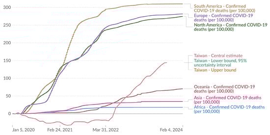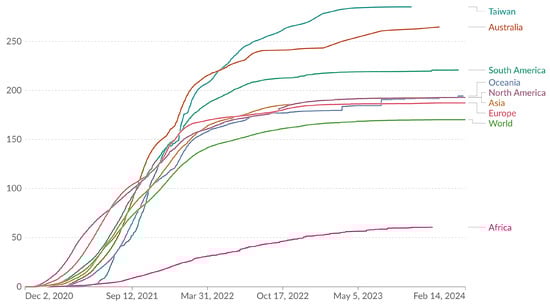 Total COVID-19 vaccine doses administered per 100 people. All doses, including boosters, are counted individually. (Results were analyzed by Our World in Data, “Cumulative COVID-19 vaccinations per 100 people” [dataset] (https://ourworldindata.org/grapher/covid-vaccination-doses-per-capita?country=TWN~OWID_ASI~OWID_WRL~OWID_EUR~OWID_OCE~OWID_NAM~AUS~OWID_AFR~OWID_SAM, accessed on 15 February 2024) based on the original study [15]).