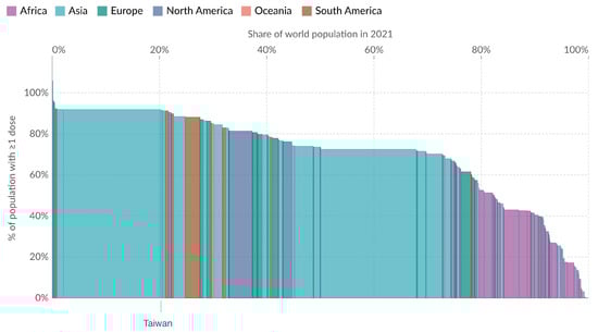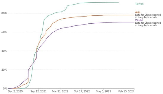 Share of people who received at least one dose of COVID-19 vaccine. Total number of people who received at least one vaccine dose, divided by the total population of the country. (Results were analyzed by Our World in Data, “people_vaccinated_per_hundred” [dataset] (https://ourworldindata.org/grapher/share-people-vaccinated-covid?country=TWN~OWID_WRL~OWID_ASI, accessed on 16 February 2024) based on the original study [15]).