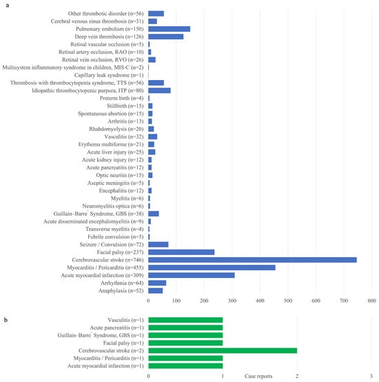 Figure 8 enhances the detailed tables by graphically highlighting the trends of adverse events of special interest (AESIs) with definitions provided in Supplementary Table S1. Figure 8a encompasses reports from 22 March 2021 to 30 September 2023, including reports on thrombotic disorders such as renal infarction, ischemic bowel diseases, portal vein thrombosis and iliac vein, intestinal vascular venous thrombosis, and superior mesenteric artery thrombosis. Notably, cerebrovascular stroke (746 cases), myocarditis/pericarditis (455 cases), and acute myocardial infarction (309 cases) were the most frequently reported conditions, highlighting the need for particular attention to these conditions following vaccination. Other significant reported adverse events include anaphylaxis (52 cases) and arrhythmia (64 cases). Figure 8b includes reports from 26 September 2023 to 31 December 2023 for the monovalent Moderna XBB.1.5 vaccine containing the Omicron XBB.1.5 variant antigen and the monovalent Novavax vaccine containing the original strain antigen.
