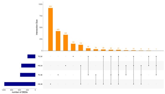 Upset plot showing intersection size between Harderian glands (Hgs) and tracheas (Tcs) at both, 24 and 48 h post-vaccination with Newcastle disease virus LaSota. Intersection size show the number of differentially expressed genes (DEGs) between the analyzed samples. Twenty-one DEGs were common between all combinations of organs and timepoints.