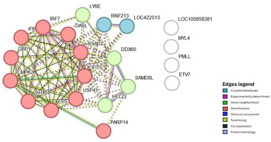 Considering all four analyses—Hgs at 24 and 48 hpv and Tcs at 24 and 48 hpv—twenty-one DEGs were present in both organs and both sampling timepoints (Figure 1). Twenty of these were consistently either up- or down-regulated in all four analyses, while one, myosin, light chain 4 (MYL4), was up-regulated at Hgs 24 hpv but down-regulated in the other three analyses. Because of this, it was used for PPI analysis but not considered a core gene. The group formed by interferon alpha inducible protein 6 (IFI6), 2′-5′ oligoadenylate synthetase-like (OASL), poly(ADP-ribose) polymerase family member 14 (PARP14), DExD/H-box helicase 60 (DDX60), DExH-box helicase 58 (DHX58), and interferon regulatory factor 7 (IRF7), among fourteen other common DEGs, will be subsequently be referred to as the core genes (Supplementary Table S5). The PPI interaction and enrichment map from the core genes formed three clusters. Those clusters were related to host innate immune response processes either by interferon, cytokine, and caspase regulation or the regulation of viral genome replication (Figure 2, Supplementary Table S6).