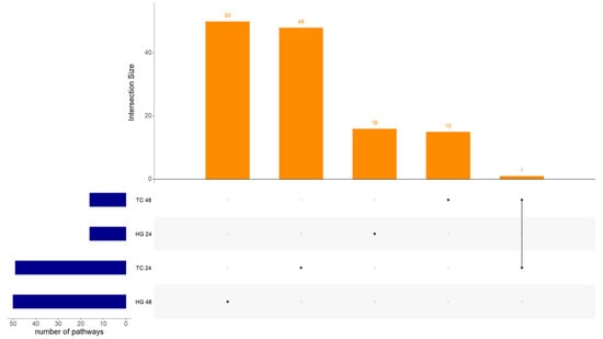 Upset plot showing intersection size between Harderian glands (Hgs) and tracheas (Tcs) at both, 24 and 48 h post-vaccination with Newcastle disease virus LaSota. Intersection size show the number of regulated pathways between the analyzed samples. No common pathways were found between all combinations of organ and timepoint.