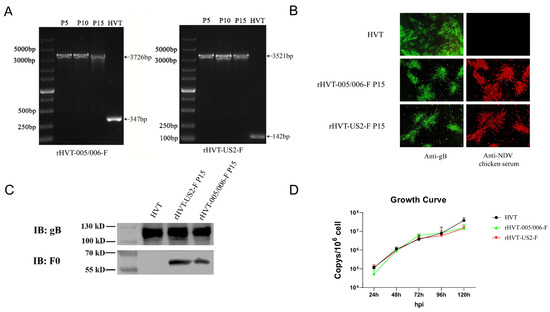 Characterization of rHVT-US2-F and rHVT-005/006-F in vitro. (A) Stability assessment of the F cassette in rHVT-005/006-F and rHVT-US2-US2-F via PCR. (B) CEF cells infected with the 15th passage of rHVT-005/006-F or rHVT-US2-F, as well as HVT, identified by IFA. (C) Western blot analysis of rHVT-05/06-F or rHVT-US2-F and HVT. (D) Growth kinetics of rHVT-005/006-F, rHVT-US2-F and HVT in vitro. The y-axis represents the viral copy number per 1,000,000 cells.
