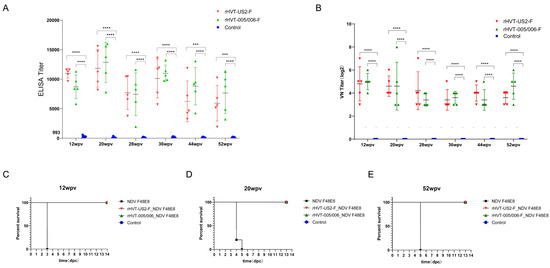 (A) Humoral immunity induced by rHVT-005/006-F and rHVT-US2-F. Antibody levels were assessed using a commercial NDV antibody ELISA kit. The y-axis represents antibody titers, with titers ≥933 considered positive. The x-axis represents sera samples were collected at 12, 20, 28, 36, 44, and 52 wpv. (B) Neutralizing antibody titers against virulent NDV in SPF chickens inoculated with rHVT-005/006-F and rHVT-US2-F at 12, 20, 28, 36, 44, and 52 wpv. (C) Survival curve of chickens challenged with virulent NDV at 12 wpv. (D) Survival curve of chickens challenged with virulent NDV at 20 wpv. (E) Survival curve of chickens challenged with virulent NDV at 52 wpv. *** p < 0.001, and **** p < 0.0001.