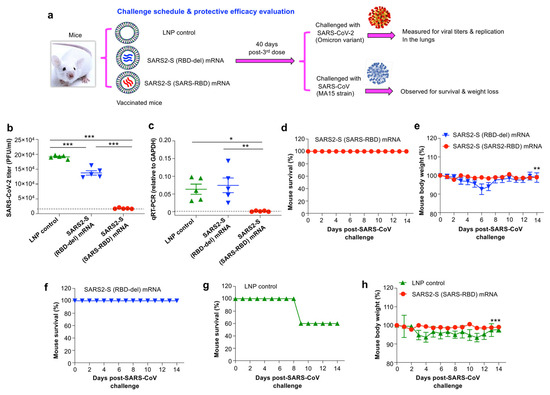 - Hajnik, R.L.; Plante, J.A.; Liang, Y.; Alameh, M.G.; Tang, J.; Bonam, S.R.; Zhong, C.; Adam, A.; Scharton, D.; Rafael, G.H.; et al. Dual spike and nucleocapsid mRNA vaccination confer protection against SARS-CoV-2 Omicron and Delta variants in preclinical models. Sci. Transl. Med. 2022, 14, eabq1945. [Google Scholar] [CrossRef]
