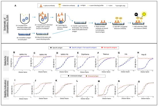 Summary of the competitive ELISA results for assessing the compatibility and stability of aluminum-salt-adjuvanted t-NRRV, D, T, Hib, and Hep B antigens in the presence of one another and the wP antigen. Schematic of the competitive ELISA format (A). The selectivity and stability-indication results for NRRV P[4] (B,I), P[6] (C,J), P[8] (D,K), Diphtheria (E,L), Tetanus (F,M), Hib (G,N), and Hep B (H,O) are shown. See Methods section for description of the samples and stress conditions. Data are presented as the mean ± SD (n = 2–3).