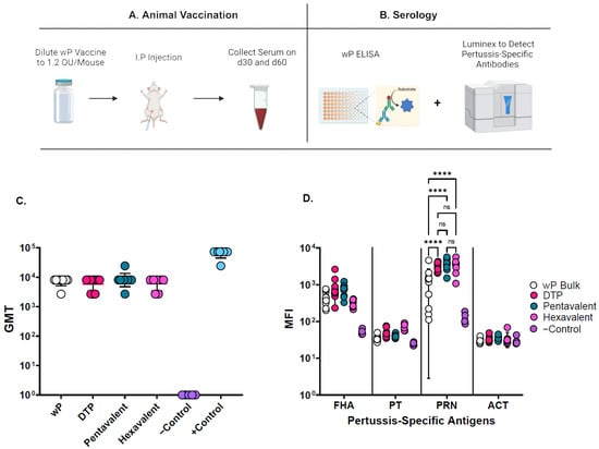 Mouse immunogenicity studies for measuring wP were conducted under strict compliance with the Wadsworth Center’s Institutional Animal Care and Use Committee (IACUC). Briefly, female BALB/c mice aged 6–8 weeks were obtained from Taconic Biosciences (Germantown, NY, USA) and housed under conventional, specific pathogen-free conditions. In separate experiments, mice (n = 8–10 per experimental group; n = 6 for control groups) were vaccinated on day 0 with mock wP-containing trivalent, pentavalent, and hexavalent formulations. Final volumes of 250 µL were injected via the intraperitoneal (I.P) route. Blood was collected from the mice via the submandibular vein on days 30 and 60. The resulting sera were analyzed using a combination of the wP ELISAs and multiplex immune assays, as described in detail below.
