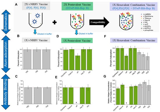 Compatibility of recombinant t-NRRV antigens with pentavalent antigens (D, T, wP, Hib, and Hep B) in hexavalent combination vaccine (t-NRRV + pentavalent) antigens. (A) is a schematic representation of adsorption of each antigen in t-NRRV, pentavalent vaccine, and hexavalent vaccine. Alum-adsorption and antibody-binding (relative antigen concentration normalized to 100% for each antigen) results for t-NRRV (B,C), “default” pentavalent vaccine (D,E) and hexavalent vaccine (F,G) are shown. Antibody binding and adsorption for all antigens except wP were measured using the ELISA. For the wP antigen, the adsorption study was performed separately (see Methods), and in vivo mouse immunogenicity results (*) are presented in Section 3.5. Data are presented as the mean ± range (n = 2). When antigen adsorption to alum values were 100%, a range of ±10% was assigned based on the estimated LOQ of the assay.