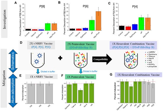 Investigation and mitigation of t-NRRV antigen desorption from aluminum-salt adjuvants when formulated with the components of a mock pentavalent combination vaccine. (A–C) represent the investigation of NRRV antigen desorption from AH adjuvants for each monovalent adsorbed NRRV antigen by the individual components of a mock DTP vaccine with P[8] (A), P[6] (B), and P[4] (C). (D) is schematic representation of adsorption of each antigen, in t-NRRV, the pentavalent vaccine, and the “mitigated” hexavalent AH combination vaccine. (E–G) represent the percentage adsorption of each antigen when formulated as a (E) t-NRRV control (AH adjuvant only), (F) mock mitigated pentavalent formulation (AH adjuvant only with D, T, wP, Hib, and Hep B antigens), and mock hexavalent formulation (AH adjuvant only with t-NRRV, D, T, wP, Hib, and Hep B antigens). Adsorption for all the antigens except wP was measured using ELISA. wP adsorption was performed using a sucrose centrifugation assay (see Methods). Data are presented as the mean ± range (n = 2). When antigen adsorption to alum values were 100%, a range of ±10% was assigned based on the estimated LOQ of the assay.