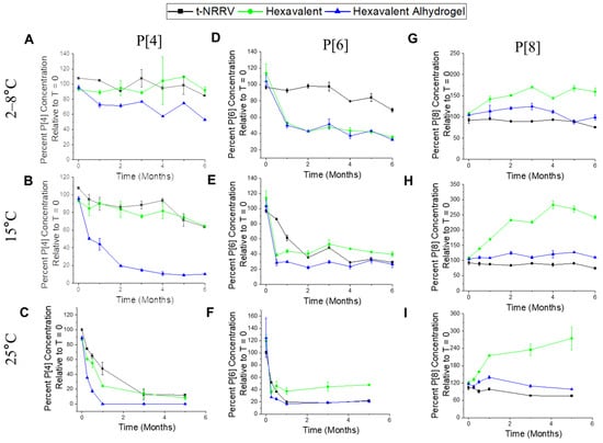 Antigen–antibody binding results (percentage concentration relative to T = 0 using the competitive ELISA) for each of the recombination protein NRRV P[4], P[6], and P[8] antigens formulated as a t-NRRV control (AH adjuvant only), mock hexavalent formulation (AP + AH adjuvants with t-NRRV, D, T, wP, Hib, and Hep B antigens), and mock hexavalent AH formulation (AH adjuvant only with t-NRRV, D, T, wP, Hib, and Hep B antigens) during storage at 2–8 °C, 15 °C, and 25 °C. Antigen–antibody binding for the P[4] antigen at 2–8 °C (A), 15 °C (B), and 25 °C (C) in the three formulations. Antigen–antibody binding for the P[6] antigen at 2–8 °C (D), 15 °C (E), and 25 °C (F) in the three formulations. Antigen–antibody binding for the P[8] antigen at 2–8 °C (G), 15 °C (H), and 25 °C (I) in the three formulations. Samples at 25 °C were assayed more frequently in the first month, and studies were performed up to 5 months (instead of 6 months for samples stored at other temperatures. Data are presented as mean ± SD (n = 4).