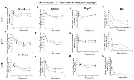 We then evaluated the stability profile of the aluminum-salt-adjuvanted pentavalent antigens in the same two mock hexavalent formulations (adjuvanted with either AH + AP or AH-only), but in this case, compared to a different control (pentavalent formulation in AH + AP without the t-NRRV antigens). For four of the pentavalent antigens (D, T, Hib, and Hep B), the stability profile was monitored by the competitive ELISAs (binding to antigen-specific mAbs; see above) in the various formulations at 2–8 °C, 15 °C, and 25 °C (up to 6 months). At 4 °C, no notable losses in antibody binding were observed for three of the pentavalent antigens (D, T, Hep B; Figure 6A,B and C, respectively), and no differences were observed in the three formulations. At accelerated temperatures (15, 25 °C), expected losses in antibody binding values were seen, again with no differences noted between the formulations for three of the pentavalent antigens (D, T, Hep B; Figure 6E–G,I–K). For the Hib antigen, instability was observed in all the formulations at both 2–8 °C (Figure 6D) and accelerated storage conditions (15 °C and 25 °C) (Figure 6H,L), with the most destabilization seen in the AH-only hexavalent formulation. This loss of antibody binding of the Hib antigen over time is likely due to the known interaction of the negatively charged Hib antigen with the positively charged AH adjuvant, leading to steric hinderances as well as chemical instabilities [34,35]. Overall, these results indicate the t-NRRV antigens have no effect on the stability of the four pentavalent antigens.