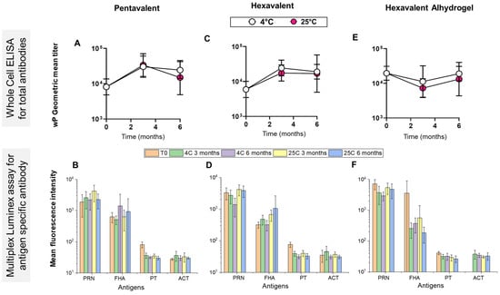 Stability of the whole-cell pertussis antigen (wP) in three different formulations as measured by the mouse immunogenicity assay. Samples include a mock pentavalent formulation control (D, T, wP, Hib, and Hep B formulated with AH + AP adjuvants), mock hexavalent formulation (t-NRRV, D, T, wP, Hib, and Hep B formulated with AP + AH adjuvants) or mock hexavalent-Alhydrogel formulation (t-NRRV, D, T, wP, Hib, and Hep B formulated with AH adjuvant only). (A,C,E) Geometric mean titers obtained using whole-cell ELISA for the wP antigen in the three formulations stored at 2–8 °C and 25 °C at different timepoints, with error bars representing geometric standard deviation (B,D,F). Mean fluorescence intensity obtained using the multiplex Luminex assay for different components of the pertussis antigen (PRN, FHA, PT, and ACT) for the wP antigen in the three formulations stored at 2–8 °C and 25 °C at different timepoints with error bars representing the standard deviation of the mean fluorescence intensity. Data are presented as the mean ± SD (n = 8–10).