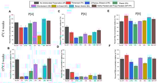 Stability profile of the AH-adsorbed recombinant protein t-NRRV antigens (P[8], P[6], and P[4]) in the presence of the different preservatives as measured by the competitive ELISA. The relative antigen binding of each antigen to an antigen-specific mAb is shown as a percentage concentration relative to time zero values after storage at 2–8 °C for 6 weeks and 15 °C for 3 weeks. Percent antigen–antibody binding for (A,B) the P[4] antigen, (C,D) the P[6] antigen, and (E,F) the P[8] antigen in the presence and absence of the indicated preservatives. Data are presented as the mean ± SD (n = 4).