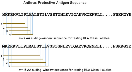 We tested exhaustively the amino AA subsequences of PA using a sliding window approach (Figure 1) to partition the whole AA sequence of PA (Appendix A) into n-mers for PA-HLA analyses. Given the different groove lengths of HLA Class I and II molecules, we used a length of 9-mer for Class I and 15-mer for Class II alleles (Figure 1). For each n-mer, all possible subsequences were generated (number of subsequences = length of PA − n).