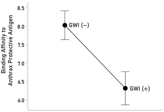 It can be seen in Table 1 that of 82 veterans who reported receiving the anthrax vaccine, 37 developed GWI, whereas 45 did not. We hypothesized that the latter could be due to protection against GWI afforded by the genetic, adaptive immunity makeup of individual participants. Of those who were vaccinated, we were able to successfully genotype HLA in 35 GWI(+) and 45 GWI(−) veterans. In these 80 veterans, there were a total of 127 distinct HLA alleles (69 of Class I and 58 of Class II). Of the 69 Class I alleles, none yielded the requisite combination of percentile rank <2 and immunogenicity score > 4 for successful immunogenicity against PA, and hence they were not further analyzed. With respect to the Class II alleles, 18 occurred in the GWI(−) but were absent in the GWI(+) group; this proportion of 18/58 (31.0%) observed in the GWI(−) group was significantly different from 0% in the GWI(+) group (Z = 4.62, p < 0.00001, test of two proportions). These results suggest protection offered by these alleles against the offending anthrax vaccine PA. This hypothesis predicts that these alleles are associated with HLA cell-surface proteins that would bind with a high affinity to PA, the first necessary step for the successful formation of an n-mer and HLA molecule binding motif complex which would then engage the CD4+ lymphocytes for the subsequent production of anti-PA antibodies. We tested this prediction by estimating in silico the binding affinities of the 18 alleles that occurred only in the GWI(−) group and found that each allele indeed possessed a high binding affinity (percentile rank < 1) to PA (Table 2), thus lending strong support to the hypothesis. In addition, we compared the overall binding affinity of the 58 HLA Class II alleles between the GWI(−) [N = 45] and GWI(+) [N = 30] groups by analyzing the population of binding affinity estimates of <1 observed across the 58 alleles and the 749 15-nmer AA subsequences of PA. There were 2123 binding affinity values available for the GWI(−) and 1603 for the GWI(+) groups. We found a statistically significant overall higher binding affinity in the GWI(−) vs. GWI(+) group (Figure 3; p = 0.003, independent samples t-test, N = 3726). This result, in conjunction with the presence of 18 unique alleles in the GWI(−) group only, underscores the protective role of HLA genetic makeup against developing GWI in anthrax-vaccinated veterans and, conversely, points to a lack of sufficient HLA protection as a contributor to GWI following anthrax vaccine administration.
