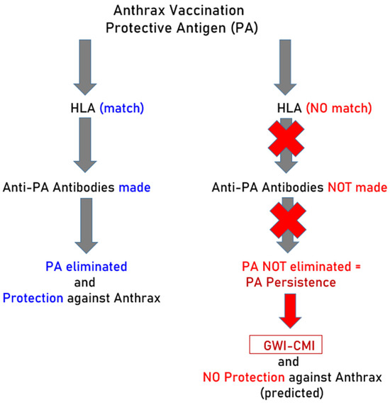 The cardinal characteristic of GWI is the involvement of multiple systems, hence its equivalent term “Chronic Multisystem Illness” (CMI) [8,9,10,11,12,13]. Remarkably, CMI has now been observed in veterans of subsequent Iraq/Afghanistan wars [43,44]. Originally, GWI was attributed to chemical exposures, including nerve gas, burning pits, insecticides, etc. [14,32]. Although these could be contributing factors, as we discussed above, the occurrence of CMI in Iraq/Afghanistan war veterans and in nondeployed veterans point to other basic causes. A common such factor is anthrax vaccination, which is compulsory in the U.S. armed forces. The epidemiological and clinical findings reported here, together with the laboratory findings reported previously [22,23,24], document the harmful effects of the anthrax vaccine and raise concerns about its long-term safety. A key contribution of the present study is the discovery of a subset of HLA Class II alleles which (a) are involved in the production of antibodies, (b) are present in vaccinated healthy veterans but (c) are absent in vaccinated veterans suffering from GWI. Given the estimated high binding affinity of the motif of these HLA molecules, this observation points to the lack of the ability of vaccinated veterans with GWI to produce antibodies against the anthrax vaccine antigen, a harmful factor [24]. This idea on the interplay of biological (toxicity of PA) and immunogenetic (HLA) factors for the development of GWI in vaccinated, immunogenetically vulnerable veterans is illustrated in the schematic diagram of Figure 5. Given that active military personnel are routinely anthrax vaccinated, and that 49.5% of veterans of the Iraq/Afghanistan wars suffer from CMI [43], the concerns above need to be urgently addressed.