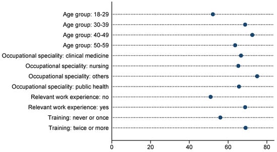 The correct answer rate for each question in the 10 case scenarios on screening for contraindications and precautions to vaccination ranged from 53.49% to 87.38% (Table 4). In the case scenarios of common diseases, such as asthma, food allergies, and febrile convulsions, the correct answer rates were high. The lowest correct answer rate was observed in two case scenarios involving children born to HIV-infected mothers (53.49% and 57.48%). Additionally, the correct answer rates were also low in some complex case scenarios, such as contraindications and precautions to vaccination in children with severe combined immunodeficiency following stem cell transplantation, patients with kidney disease, and those receiving immunosuppressive agents (Table 4). The score for this part (Figure 1) indicated that 144 (47.84%) healthcare professionals achieved an adequate level, while 157 (52.16%) did not. Notably, 81.82% of participants reached the adequate level in the 50–59 age group, which was considerably higher than in other age groups. Among healthcare professionals who did not previously participate in relevant training or only received one training session, only 29.33% achieved the adequate level. In contrast, the percentage of those who achieved the adequate level increased to 53.98% among those who had received two or more training sessions (p < 0.001).