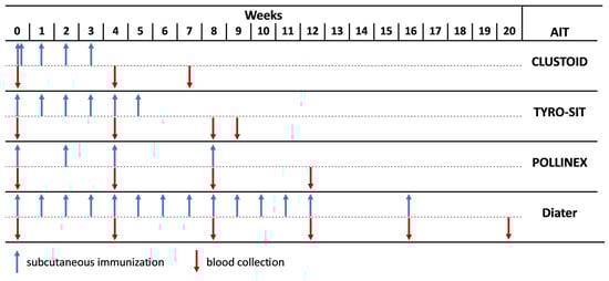 The ragweed allergen extract-specific IgG levels of rabbits immunized with CLUSTOID, TYRO-SIT, POLLINEX and Diater were evaluated by testing the rabbits’ pre-immune, immune and final immune sera against the ragweed pollen extract and the individual ragweed pollen allergens. The rabbits were immunized according to the manufacturer’s recommendation to be used for AIT in allergic patients (Table S2), and their immune sera were collected at different time points, as shown in Figure 1.