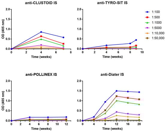 Figure 2. Induction of ragweed pollen allergen-specific IgG responses in rabbits by immunization with CLUSTOID, TYRO-SIT, POLLINEX and Diater. For CLUSTOID, 5 injections were administered over 3 weeks, for TYRO-SIT, 6 injections were administered in 5 weeks, for POLLINEX, 4 injections were administered in 8 weeks and for Diater 14 injections were administered in 16 weeks. Rabbit sera were collected before immunization (week 0) and every four weeks (i.e., week 4 for CLUSTOID, weeks 4 and 8 for TYRO-SIT and POLLINEX and weeks 4, 8, 12 and 16 for Diater) until final serum collection four weeks after the last immunization (i.e., week 7 for CLUSTOID, week 9 for TYRO-SIT, week 12 for POLLINEX and week 20 for Diater). Rabbit sera were diluted from 1:100 down to 1:50,000 and tested against ragweed pollen extract in ELISA. Mean OD values corresponding to allergen-specific IgG levels (y-axes) at different time points (x-axes) are shown. IS, immune serum.