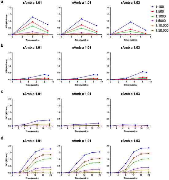 Figure 3. Comparison of levels and time courses of allergen-specific IgG responses against rAmb a 1.01, nAmb a 1.01 and rAmb a 1.03 upon immunization with (a) CLUSTOID, (b) TYRO-SIT, (c) POLLINEX and (d) Diater. Sera from rabbits immunized with the four AITs were collected before immunization and every four weeks until final serum collection four weeks after the last immunization. Rabbit pre-immune and immune serum was titrated starting at 1:100 down to 1:50,000. The mean OD values corresponding to allergen-specific IgG levels (y-axes) at different time points (x-axes) are shown.