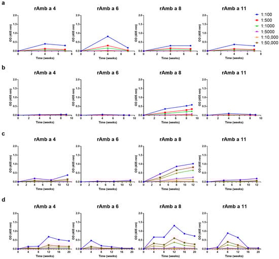Figure 4. Comparisons and time courses of allergen-specific IgG responses of rabbits against Amb a 4, Amb a 6, Amb a 8 and Amb a 11 upon immunization with (a) CLUSTOID, (b) TYRO-SIT, (c) POLLINEX and (d) Diater. Sera from rabbits immunized with the four AITs were collected before immunization and every four weeks until final serum collection four weeks after the last immunization. Rabbit pre-immune and immune serum was titrated starting at 1:100 down to 1:50,000. Mean OD values corresponding to allergen-specific IgG levels (y-axes) at different time points (x-axes) are shown.