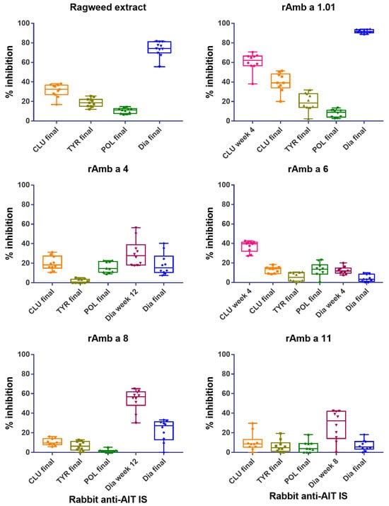 We also studied the inhibition of patients’ IgE binding to other frequently recognized allergens (i.e., Amb a 4, Amb a 6, Amb a 8 and Amb a 11) (Table S1). Except for Amb a 6, the rabbit anti-Diater antibodies inhibited patients’ IgE binding better than the antibodies induced by the other AIT vaccines (Figure 5, Table S3). However, the level of inhibition of IgE binding was relatively low. Regarding Amb a 4, the mean inhibition of IgE binding with the serum obtained at week 12 was 30.4 ± 13.7% (range: 18–56.4%), and with the anti-Diater serum obtained 4 weeks after the last immunization, the mean inhibition was 19.0 ± 11.2% (range: 7.5–40.4%) (Figure 5 and Table S3). Thus, the inhibition rates corresponded to Amb a 4-specific antibody levels (Figure 4).