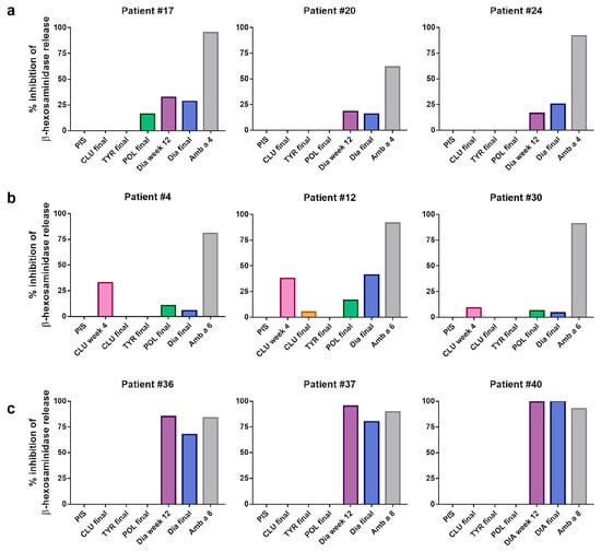 Figure 7. Inhibition of β-hexosaminidase release after incubation of ragweed allergens with AIT vaccine-induced sera. Percentages of inhibition of β-hexosaminidase release (y-axis) induced with (a) 100 ng/mL of rAmb a 4, (b) 10 ng/mL of Amb a 6 and (c) 10 ng/mL of Amb a 8 pre-incubated with CLUSTOID- (CLU), TYRO-SIT- (TYR), POLLINEX- (POL) and Diater-induced rabbit antibodies (Dia) (x-axis) when RBL cells had been sensitized with sera from three patients reactive to these allergens were tested. Rabbit allergen-specific sera were used as positive controls. PIS, pre-immune serum.