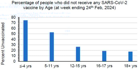 Percentage of people who remain unvaccinated with the SARS-CoV-2 vaccine by different age groups in the US (from 14 December 2020 to 24 February 2024), as per data from the US CDC (https://covid.cdc.gov/covid-data-tracker/#vaccine-delivery-coverage, accessed on 16 March 2024).