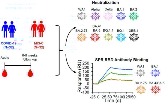 Limited knowledge is available on the evolution of the antigenic landscape in unvaccinated SARS-CoV-2-infected children hospitalized for COVID-19 vs. MIS-C against circulating SARS-CoV-2 variants. Therefore, we analyzed samples from a total of 64 children (<20 years old) who were hospitalized between May 2020 and August 2022 for SARS-CoV-2 neutralizing antibodies and RBD binding antibodies using surface plasmon resonance (SPR) against WA1 and Omicron subvariants (Figure 2). Pediatric samples were divided into the following two categories: n = 32 children who have been hospitalized with a diagnosis of COVID-19 per SARS-CoV-2 antigen, PCR, or at-home test (COVID-19), and n = 32 children hospitalized with a diagnosis of MIS-C per the Center for Disease Control’s criteria (MIS-C). For each category, baseline blood was collected at enrollment and upon hospitalization. Of those, 19 subjects (11 COVID-19, 8 MIS-C) had follow-up samples available at six to eight weeks post-enrollment. The majority of subjects were non-Hispanic males hospitalized at a median age of 10 years (interquartile range 6–15 years) (Table 1).