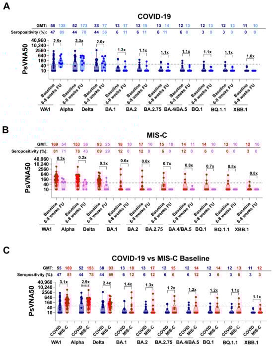Neutralizing antibodies in children with COVID-19 vs. MIS-C against circulating SARS-CoV-2 variants. SARS-CoV-2 neutralization assays were performed by using pseudoviruses expressing the spike protein of WA1, Alpha, Delta, or the Omicron subvariants BA.1, BA.2, BA.2.75, BA.4/BA.5, BQ.1, BQ.1.1, and XBB.1 subvariants in 293-ACE2-TMPRSS2 cells. (A–C) SARS-CoV-2 neutralization titers were determined in each of the 64 children hospitalized with COVID-19 (n = 32) or MIS-C (n = 32) at the time of enrollment and after 6 to 8 weeks (COVID-19; n = 11 and MIS-C; n = 9). The assay of each sample was performed in duplicate to determine the 50% neutralization titer (PsVNA50). PsVNA50 titers for COVID-19 children (A) are shown in dark blue (baseline) and light blue (after 6–8 weeks), whereas PsVNA50 titers for MIS-C children (B) are shown in red (baseline) and pink (6–8 weeks). (C) PsVNA50 titers at the baseline of the COVID-19 cohort (n = 32) versus the baseline of the MIS-C cohort (n = 32) are represented. The heights of the bars and the numbers over the bars indicate the geometric mean titers (GMT), and the whiskers indicate 95% confidence intervals. The horizontal dashed line indicates the seropositive cut-off for the neutralization titers (PsVNA50 of 60). Percent seropositivity (%S) for each group was calculated as the number of seropositive samples divided by the total number of samples × 100 in the group. A fold change of 6–8 weeks follow-up compared with baseline samples is shown for PsVNA50 titers of each strain. The limit of detection for the neutralization assay is 1:20. Differences between the baseline vs. follow-up within each SARS-CoV-2 strain (for (A,B)) or between COVID-19 vs. MIS-C (C) were analyzed by ANOVA with Kruskal–Wallis test for multiple comparisons. Statistically significant p-values are shown.