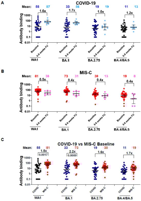 Binding antibodies in the serum/plasma of children with COVID-19 or MIS-C to the receptor binding domain of the ancestral SARS-CoV-2 WA1 strain and Omicron BA.1, BA.2.75, and BA.4/BA.5 variants. (A–C) Total antibody binding (determined by maximum resonance units, Max RU) of 1:10 diluted serum or plasma to purified WA1 spike RBD, BA.1 spike RBD, BA.2.75 spike RBD, and BA.4/BA.5 spike RBD was measured by SPR. Data are shown by disease groups for samples from children hospitalized for COVID-19 (n = 32) and for children admitted to the hospital for MIS-C (n = 32). (A) For the COVID-19 cohort, dark blue represents the baseline samples, whereas light blue represents the 6–8-week samples. (B) For the MIS-C cohort, red represents the baseline samples and pink represents the 6–8-week samples. The heights of the bars and the numbers over the bars indicate the mean antibody binding values, and the whiskers indicate 95% confidence intervals. A fold change of 6–8 weeks follow-up compared with baseline samples is shown for the RBD-binding antibodies of each strain. All SPR experiments were performed in duplicate, and the researchers performing the assay were blinded to sample identity. The variations for duplicate runs of SPR were <5%. The data shown are the average values of two experimental runs. The statistical significances for the baseline vs. follow-up within each SARS-CoV-2 strain (for (A,B)) or between COVID-19 vs. MIS-C (C) at baseline were analyzed by ANOVA with Kruskal–Wallis test for multiple comparisons. Statistically significant p-values are shown.