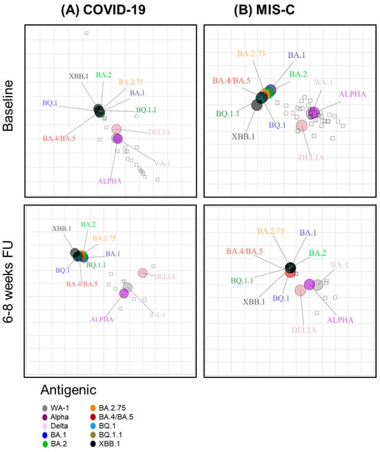 Antigenic cartography in children with COVID-19 vs. MIS-C. Individual antigenic maps were generated for each COVID-19 or MIS-C cohort ((A,B), respectively) at baseline and 6–8 weeks follow-up time points against SARS-CoV-2 WA1, Alpha, Delta, and the Omicron subvariants. Black diamonds correspond to each individual sera/plasma. One antigenic distance represented by each grid square corresponds to a twofold dilution of the neutralization assay.