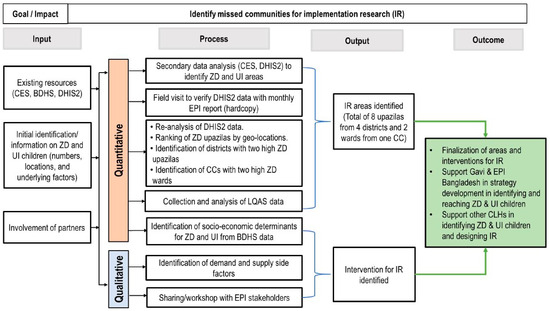 Figure 1. Conceptual framework for the rapid assessment of zero-dose (ZD) and under-immunized (UI) children. The RCA conceptual framework is used for quickly triangulating existing data to identify missed communities and develop more targeted interventions to reach ZD and UI children. Triangulation is an integral part of the quantitative methodology used to identify areas in which to conduct RCAs, with qualitative information also used to develop strategies for identifying and reaching ZD and UI children [17]. Acronyms: BDHS, Bangladesh Demographic and Health Survey; CC, city corporation; CES, Coverage Evaluation Survey; EPI, Expanded Programme on Immunization; IR, implementation research; CLH, Country Learning Hub.