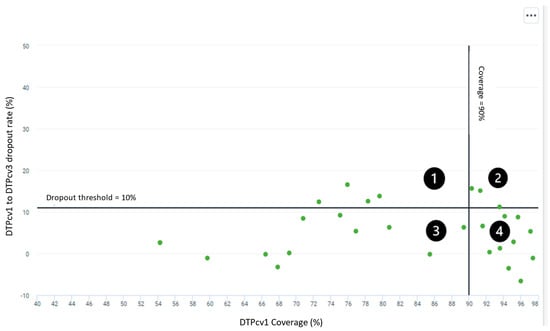 Figure 3. Scatter plot of monthly DTPcv1 coverage (%) versus DTPcv1-DTPcv3 dropout rate by district in Rwanda. (1) Low DTPcv1 coverage (<90%) and high dropout (>10%) = access and utilization issues. (2) High DTPcv1 coverage but high dropout = utilization issues. (3) Low DTPcv1 coverage but low dropout = access issues. (4) High DTPcv1 coverage and low dropout = No access and utilization issues. Each green dot is representative of a district in Rwanda.
