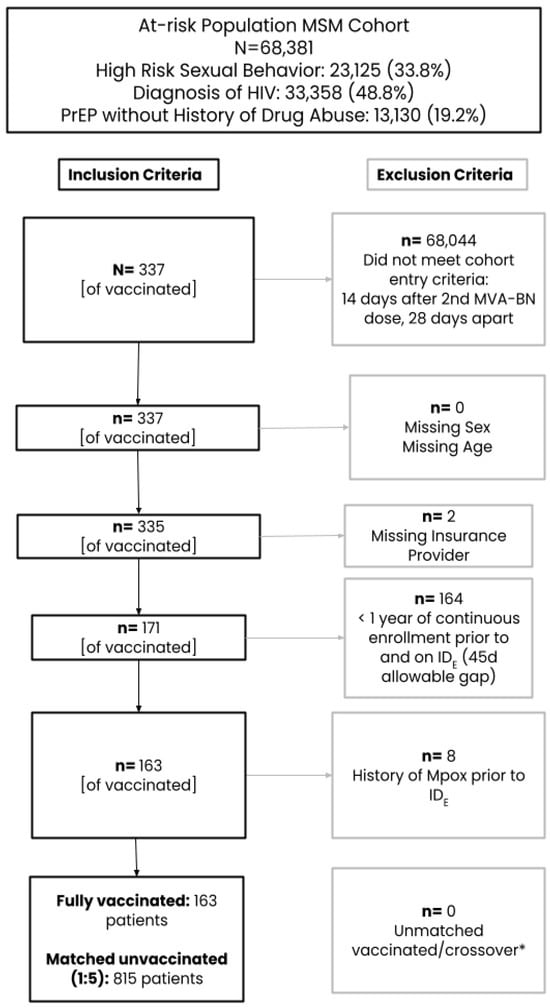 Demographic variables were assessed on the index date, and clinical variables were assessed during the baseline period, defined as the start of available data (as early as 1 April 2021) until 1 day before the index date (ranging from 1 August to 30 September 2022). After patient selection and CEM, 1:1 propensity score (PS) matching was attempted to control for confounding by measured covariates between vaccinated and unvaccinated groups. The PS was estimated using multivariable logistic regression based on the probability of MVA–BN exposure conditional on the following covariates: age, region, insurance provider, race, HIV infection, PrEP use during baseline, history of sexually transmitted infections (STI), evidence of autoimmune conditions or non-HIV related immunocompromised conditions, history of select comorbidities, and prior AESIs (for the assessment of safety outcomes only).