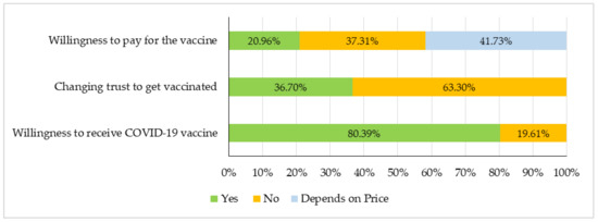 HCWs response to willingness to receive vaccination, change in trust in vaccination, and willingness to pay for the vaccine. Total number of responses: 2732.